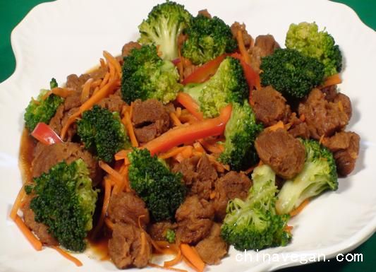 材料:干素肉块80公克、绿花椰菜150公克、红萝卜丝60公克