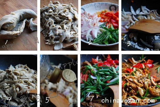 4、放入撕好的面筋,拌炒,面筋差不多到7成熟。