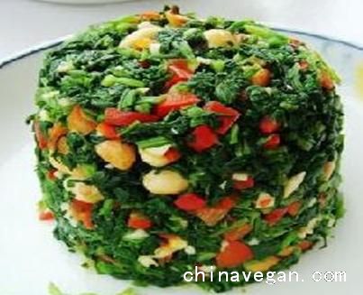 原料:芹菜叶、红菜椒、花生仁、蒜末、醋、盐,生抽、味精、香油、糖、适量;