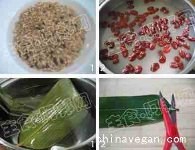 1、干粽叶用清水浸泡一天,捞出洗净,再放锅中煮10分钟后捞出; 2、用剪子剪去尾部的硬杆,以免包粽子的时候戳破粽叶。