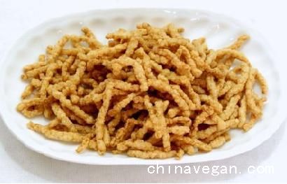 3、起锅,锅中放油,待油温6成左右,将茄子、素肉丝过油,然后倒出沥干油.