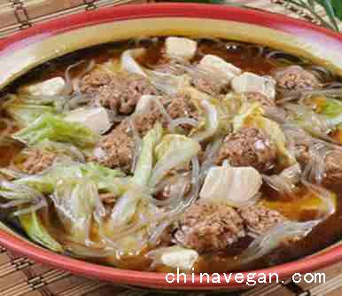 材料: 素肉丸15个,豆腐一块,白菜200g,粉条50g。