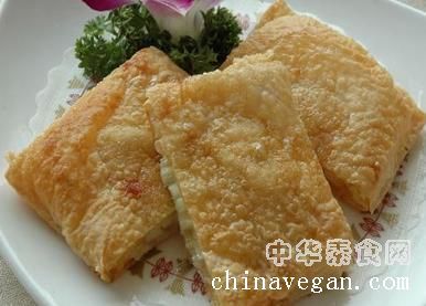 材料:油腐衣一张、素虾仁、芹菜、适量。