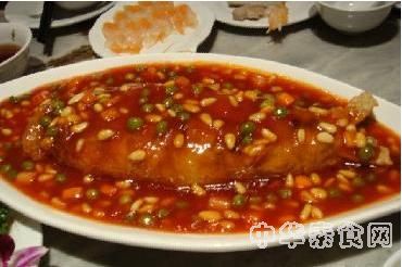 4、 下白糖、黄醋、酱油、清水100毫升略熬、再放入松子、青豆、玉米、番茄沙司、着水粉上芡,溜香油出锅浇鱼周身即成。