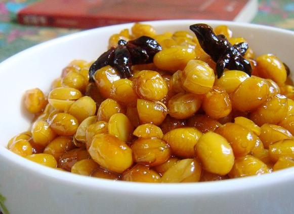 原料:黄豆、八角做法:1、黄豆洗净,泡24小时以上,待豆子涨大。2、起锅热油,爆香姜丝、八角。黄豆沥干水分,放入锅中翻炒半分钟后,加酱油、糖,再淋入适量水(刚好没过黄豆)继续翻炒,待水滚后,转小火,加盖焖至汁收干(此时黄豆的表皮也起皱),最后放蘑菇精即可出锅。