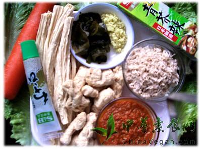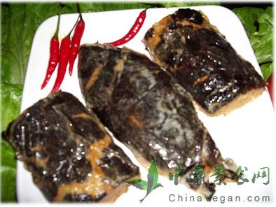图 13、把腐竹挤干水切小,加入姜片与少许泡昆布的水(增加素鱼海腥味),用果汁机打成腐竹浓酱。4、胡萝卜切丁用果汁机打成胡萝卜浓酱。5、把上叙素肉纤维、腐竹酱、胡萝卜酱、倒在一大碗中,加入其总量1/5的玉米淀粉、(或绿豆淀粉)盐、素易鲜、搅拌均匀、收浆、(即成生素鱼肉料)。6、在操作台上铺上豆腐衣,在豆腐衣上再铺上一张紫菜(没有整张的用碎的铺均匀也可)7、把收好浆,搅拌均匀的素鱼肉料一半(视腐衣、紫菜大小酌情)置紫菜上,卷成7-8公分横径的椭圆型素鱼肉卷(见图 2)