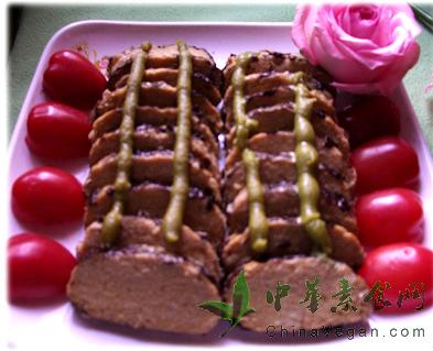 图 28、再在素鱼肉卷外用保鲜膜包裹定型,放置盘内。9、把全部完工的素鱼肉卷连盘放入微波炉内高温加热5--6分钟(或置蒸锅内蒸10--15分钟),取出透凉。10、把素三文鱼切成一公分左右厚鱼片,浇上芥末酱即可上桌。特点:素三文鱼内由含植物高蛋白、植物蛋白纤维、多种维生素与胡萝卜素,铁、钙...等素材制作,肉质鲜嫩、富有弹性、其口感与营养成分都与真鱼相似。*注:不爱吃芥末者,可把它做成清蒸素海鳗或素熏鱼。转载请注明来源: