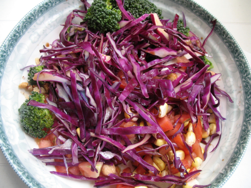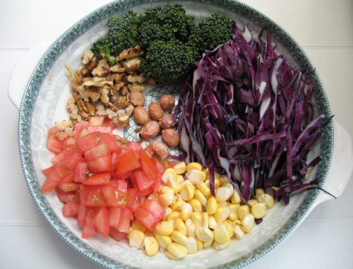 材料:紫甘蓝、生核桃、生花生、生玉米粒、西兰花、西红柿