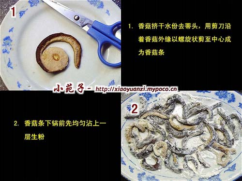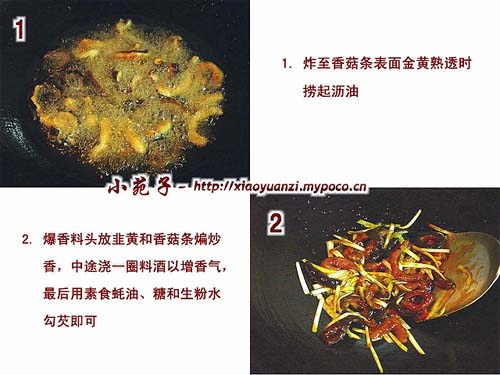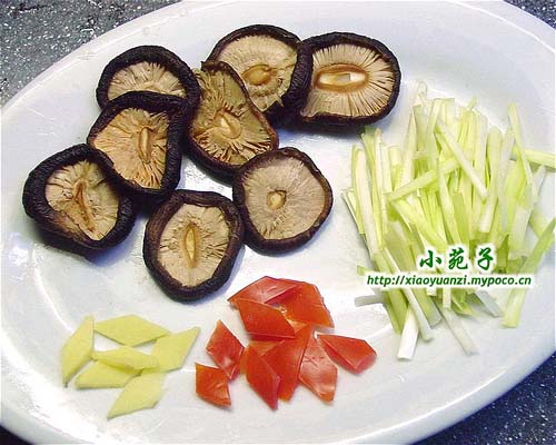 材料:香菇8朵(浸软挤干水份)、韭黄段1两、姜片和红椒片适量