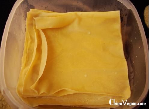 这道菜其实很简单,主要是掌握好腐皮的软度,第一次用这包腐皮时,不了解其韧度,以为跟以前用过的腐衣一样,直接用冷水泡软,以至都