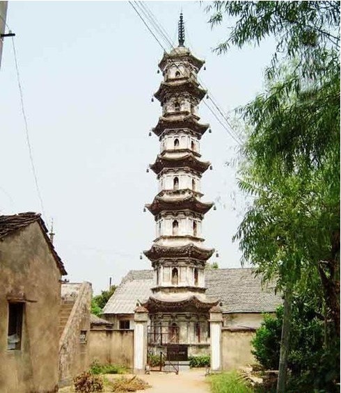 瘗埋舍利的佛塔,位于浙江省龙游县湖镇下街舍利寺院内,建于北宋嘉祐三年(1058年)。为六面七层仿木楼阁式实心砖塔,高27.31米。每层皆砌出平座、柱枋、斗栱形式,每面中央设壶门式壁龛,内供佛像。塔檐用菱角牙子层层叠涩出檐,起翘弧度较大,顶层檐角安铁制风铎,转角及补间用四铺作单抄斗栱。塔顶安铁制刹柱,置相轮六重。该塔比例修长,每层层高与平面对径皆以相同的比例收缩,故外轮廓为圆锥体,益增修长之感。此外,造型精确的砖制斗栱、弧度较大的屋檐起翘、龛内保存的各式青铜佛像以及铁制相轮等皆保持了宋代形制,弥足珍贵。